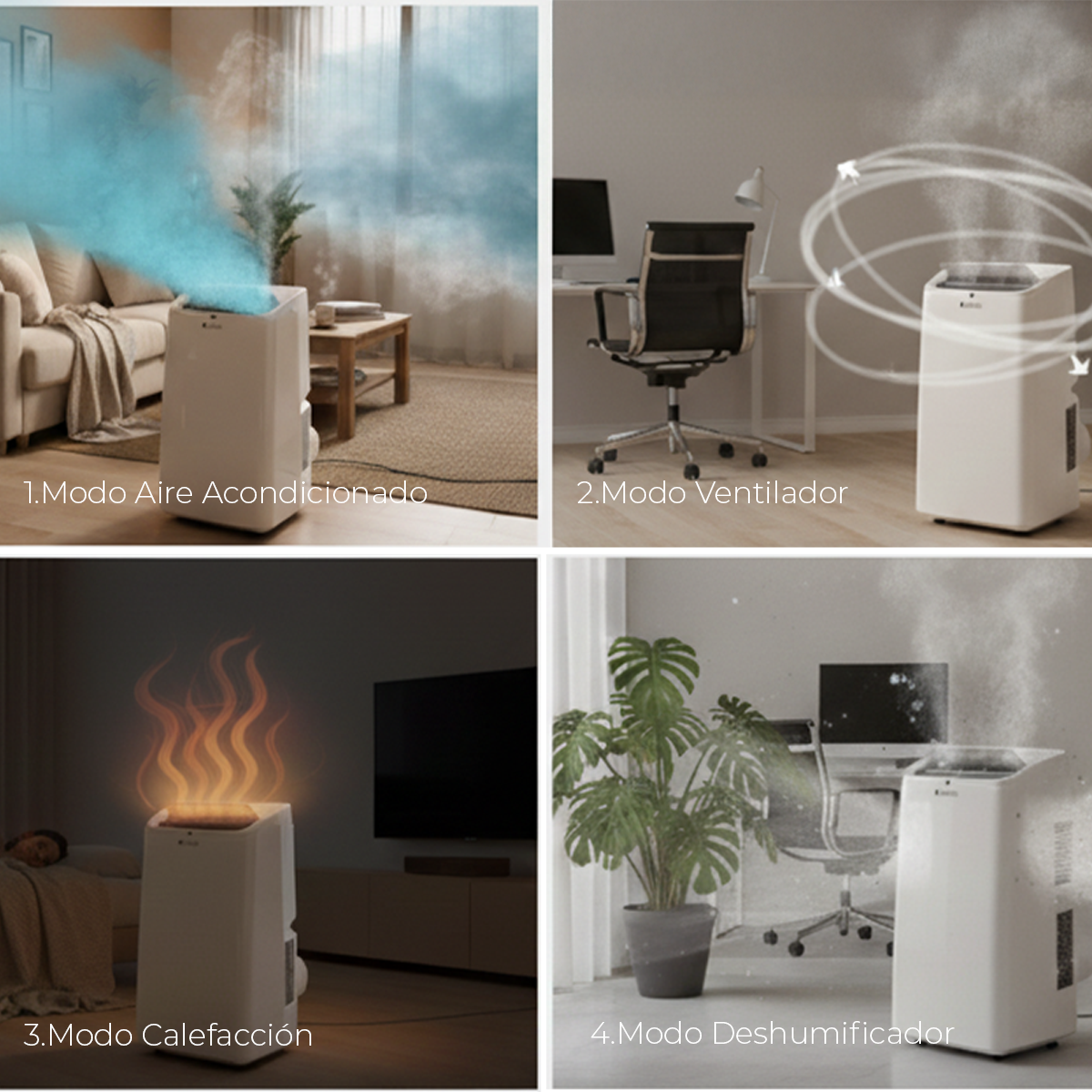 Experimenta un nivel superior de comodidad con las características de nuestro Aire Acondicionado Portátil 4 en 1 Frío / Caliente WiFi, diseñado para ofrecer no solo un hogar a la temperatura que tú quieras sino también un ambiente limpio y purificado.
